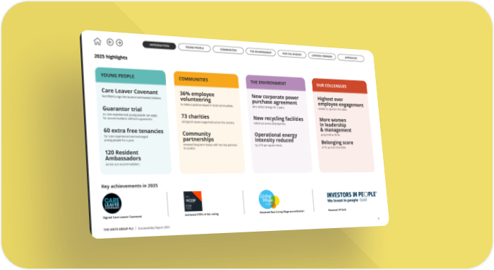 THE UNITE GROUP PLC | Sustainability Report 2025 7 2025 highlights Care Leaver Covenant first PBSA to sign this Government-backed initiative. Guarantor trial so care-experienced young people can apply for accommodation without a guarantor. 60 extra free tenancies for care experienced and estranged young people for a year. 120 Resident Ambassadors across our accommodation. 36% employee volunteering to make a positive impact in local communities. 73 charities and good causes supported across the country. Community partnerships renewed long-term leases with two key partners in London. New corporate power purchase agreement zero carbon energy for 5 years. New recycling facilities rolled out across all properties. Operational energy intensity reduced by 3.1% per square metre. Highest ever employee engagement scored 75, up from 74 in 2024. More women in leadership & management up by 0.4% to 39.1%. Belonging score of 75, up from 74 in 2024. YOUNG PEOPLE COMMUNITIES THE ENVIRONMENT OUR COLLEAGUES Key achievements in 2025 Signed Care Leaver Covenant Achieved CPD’s A-list rating Retained Real Living Wage accreditation Retained IIP Gold INTRODUCTION YOUNG PEOPLE COMMUNITIES OUR COLLEAGUES THE ENVIRONMENT APPENDICES LOOKING FORWARD