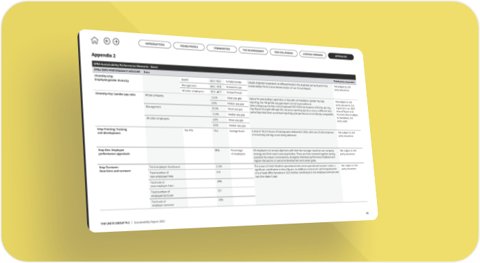THE UNITE GROUP PLC | Sustainability Report 2025 43 Appendix 2 EPRA Sustainability Performance Measures - Social EPRA SBPR PERFORMANCE MEASURE Data Third party assurance Diversity-Emp: Employee gender diversity Board: 60.0 : 40.0 % Male:Female Details of gender breakdown at different levels in the business can be found in the Sustainability Performance Review section of our Annual Report. Not subject to 3rd party assurance. Management: 65.2 : 34.8 % Male:Female All other employees: 53.3 : 46.7 % Male:Female Diversity-Pay: Gender pay ratio Whole company 12.6% Mean pay gap Data is for year ending 5 April 2025, in line with UK mandatory Gender Pay Gap reporting. Our full gender pay gap report can be found online at: www.unitegroup.com/wp-content/uploads/2021/03/Unite-Students-2024-Gender-Pay- Gap-Report-final.pdf although this statutory reporting operates across a different time period (Apr-Mar) than our annual reporting cycle (Jan-Dec) so is not directly comparable. Not subject to 3rd party assurance, but reported in our 2025 Annual Report and Accounts that is subject to mandatory 3rd party audit. 6.5% Median pay gap Management 32.0% Mean pay gap 15.0% Median pay gap All other employees 4.0% Mean pay gap 8.0% Median pay gap Emp-Training: Training and development Per FTE: 19.6 Average hours A total of 39,314 hours of training were delivered in 2025, with over 25,535 instances of e-learning training course being delivered. Not subject to 3rd party assurance. Emp-Dev: Employee performance appraisals 80% Percentage of employees All employees set annual objectives with their line manager based on our company strategy and their team’s annual priorities. These are then reviewed together during quarterly My Impact conversations, alongside individual performance feedback and regular discussions on personal development and career goals. Not subject to 3rd party assurance. Emp-Turnover: New hires and turnover Total employee headcount 2,125 The nature of Unite Students operational roles mean operational turnover makes a significant contribution to these figures. In addition a restructure and reorganisation of our head office functions in 2025 further contributed to the employee turnover and new hire rates in year. Not subject to 3rd party assurance. Total number of new employee hires 610 Total rate of new employee hires 29% Total number of employee turnover 521 Total rate of employee turnover 24% INTRODUCTION YOUNG PEOPLE COMMUNITIES OUR COLLEAGUES THE ENVIRONMENT LOOKING FORWARD APPENDICES