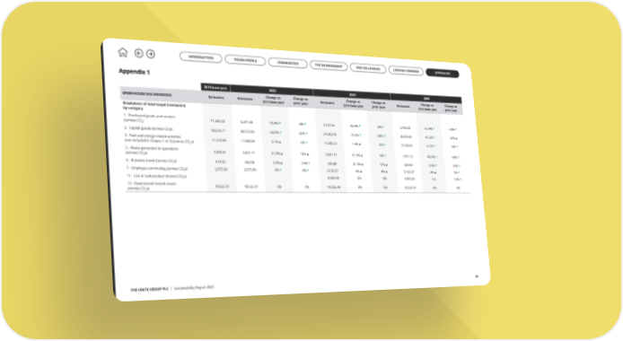 THE UNITE GROUP PLC | Sustainability Report 2025 34 Appendix 1 2019 base year 2023 2024 2025 GREENHOUSE GAS EMISSIONS Emissions Emissions Change vs 2019 base year Change vs prior year Emissions Change vs 2019 base year Change vs prior year Emissions Change vs 2019 base year Change vs prior year Breakdown of total scope 3 emissions by category 1 - Purchased goods and services (tonnes CO 2 ) 11,530.23 6,241.58 -45.9% -8% 6,127.56 -46.9% -2% 3,700.39 -67.9% -40% 2 - Capital goods (tonnes CO 2 e) 99,678.71 38,973.00 -60.9% -26% 24,282.00 -75.6% -38% 38,696.64 -61.2% 59% 3 - Fuel and energy-related activities (not included in Scopes 1 or 2) (tonnes CO 2 e) 11,519.84 11,880.04 3.1% -2% 11,680.53 1.4% -2% 10,748.01 -6.7% -8% 5 - Waste generated in operations (tonnes CO 2 e) 3,634.81 5,851.71 61.0% 14% 5,851.71 61.0% 0% 1,871.12 -48.5% -68% 6 - Business travel (tonnes CO 2 e) 418.32 432.08 3.3% -14% 590.88 41.3% 37% 403.89 -3.4% -32% 7 - Employee commuting (tonnes CO 2 e) 2,975.00 2,975.00 0% 0% 3,102.67 4% 4% 3,102.67 4% 0% 11 - Use of sold product (tonnes CO 2 e) 4,004.38 0% 0% 4,955.05 n/a -14% 13 - Downstream leased assets (tonnes CO 2 e) 18,522.31 18,522.31 0% 0% 18,526.48 0% 0% 18,522.31 0% 0% INTRODUCTION YOUNG PEOPLE COMMUNITIES OUR COLLEAGUES THE ENVIRONMENT LOOKING FORWARD APPENDICES