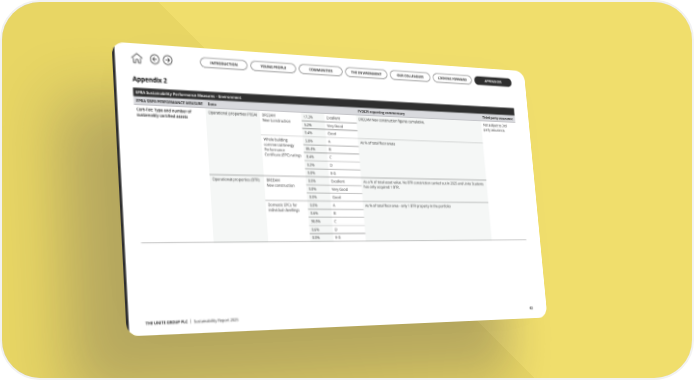 THE UNITE GROUP PLC | Sustainability Report 2025 42 Appendix 2 EPRA Sustainability Performance Measures – Environment EPRA SBPR PERFORMANCE MEASURE Data FY2025 reporting commentary Third party assurance Cert-Tot: Type and number of sustainably certified assets Operational properties (PBSA) BREEAM New Construction 17.3% Excellent BREEAM New construction figures cumulative. Not subject to 3rd party assurance. 5.2% Very Good 0.4% Good Whole building commercial Energy Performance Certificate (EPC) ratings 5.8% A As % of total floor areas 85.4% B 8.4% C 0.3% D 0.0% E-G Operational properties (BTR) BREEAM New construction 0.0% Excellent As a % of total asset value. No BTR constriction carried out in 2025 and Unite Students has only acquired 1 BTR. 0.0% Very Good 0.0% Good Domestic EPCs for individual dwellings 0.0% A As % of total floor area - only 1 BTR property in the portfolio 0.6% B 98.8% C 0.6% D 0.0% E-G INTRODUCTION YOUNG PEOPLE COMMUNITIES OUR COLLEAGUES THE ENVIRONMENT LOOKING FORWARD APPENDICES
