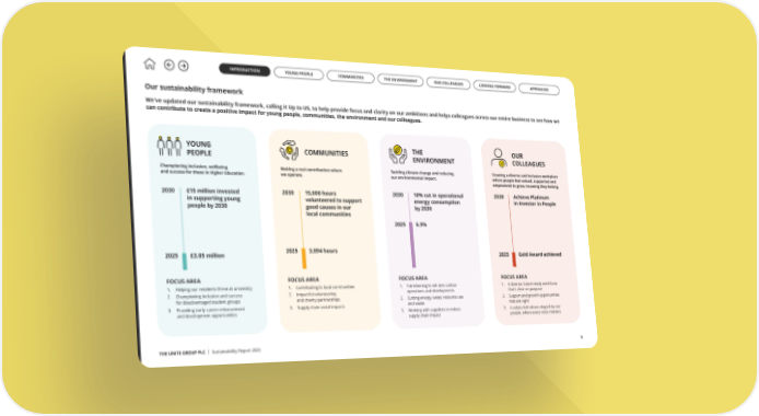THE UNITE GROUP PLC | Sustainability Report 2025 5 Our sustainability framework We’ve updated our sustainability framework, calling it Up to US, to help provide focus and clarity on our ambitions and helps colleagues across our entire business to see how we can contribute to create a positive impact for young people, communities, the environment and our colleagues. FOCUS AREA 1. Helping our residents thrive at university 2. Championing inclusion and success for disadvantaged student groups 3. Providing early career enhancement and development opportunities FOCUS AREA 1. Contributing to local communities 2. Impactful volunteering and charity partnerships 3. Supply chain social impacts FOCUS AREA 1. Transitioning to net zero carbon operations and developments 2. Cutting energy, water, resource use and waste 3. Working with suppliers to reduce supply chain impact FOCUS AREA 1. A diverse, future-ready workforce that’s clear on purpose 2. Support and growth opportunities that are right 3. A values-led culture shaped by our people, where every voice matters THE ENVIRONMENT Achieve Platinum in Investor in People Gold Award achieved 2030 2025 £3.05 million £15 million invested in supporting young people by 2030 2030 2025 3,894 hours 15,000 hours volunteered to support good causes in our local communities 2030 2025 6.5% 10% cut in operational energy consumption by 2030 2030 2025 Championing inclusion, wellbeing and success for those in Higher Education. Making a real contribution where we operate. Tackling climate change and reducing our environmental impact. Creating a diverse and inclusive workplace where people feel valued, supported and empowered to grow, knowing they belong. OUR COLLEAGUES COMMUNITIES YOUNG PEOPLE INTRODUCTION YOUNG PEOPLE COMMUNITIES OUR COLLEAGUES THE ENVIRONMENT APPENDICES LOOKING FORWARD